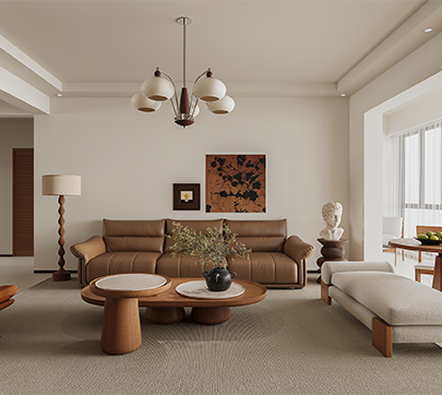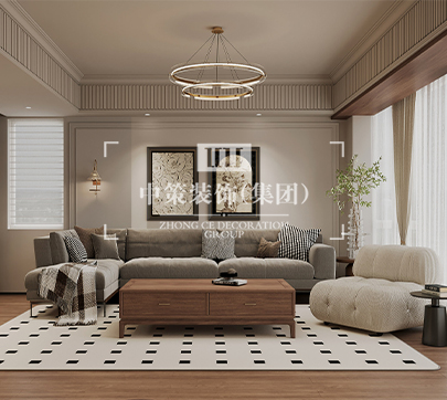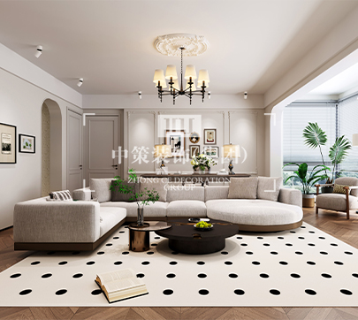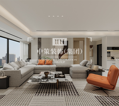 本案的客厅极简顶面辅以干练的线条与优雅的石膏线呈现,简约而有层次感。光线透过窗纱照射到客厅,地毯上几何图案的颜色刚好和家具匹配,给整个空间带来一份安详与洁净。