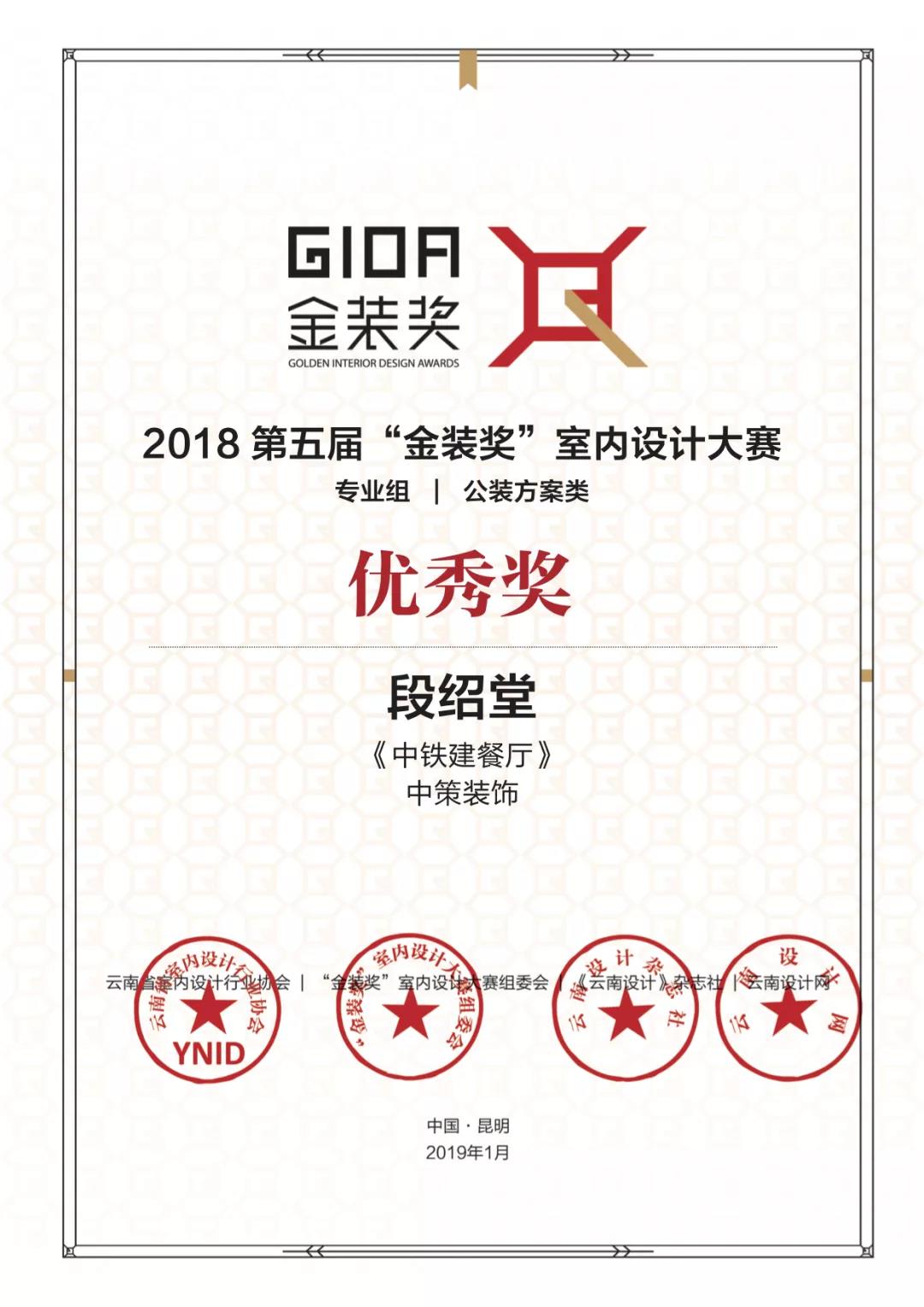 2019年1月9日,2018第五届“金装奖”室内设计大赛颁奖盛典在昆明世博园中国馆盛大举行,中策装饰(集团)有限公司高级主任设计师段绍堂作品《中铁建餐厅》荣获“公装方案类”优秀奖。