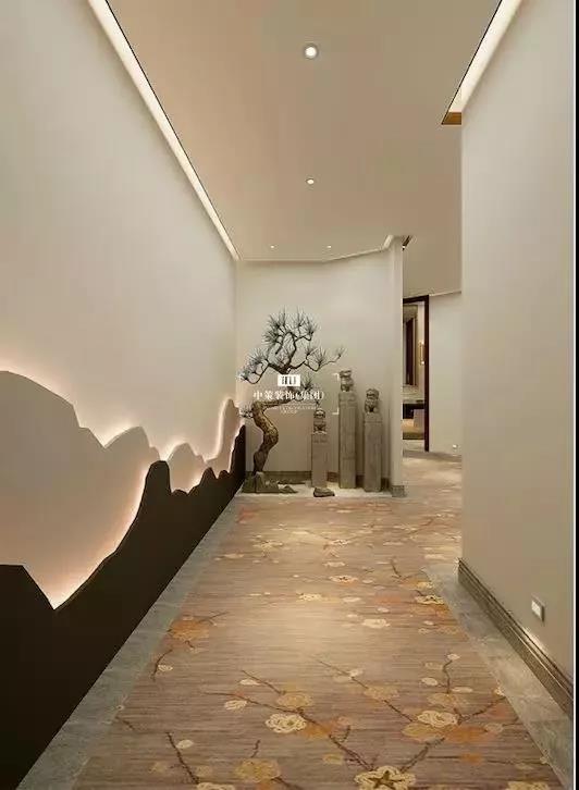 本方案是餐厅和接待厅,采用东方元素,过道的金属线条营造了一种徽派建筑高低错落的感觉。过道造型墙绵延起伏,与中式迎客松,石狮相结合,让来往的客人流连忘返。