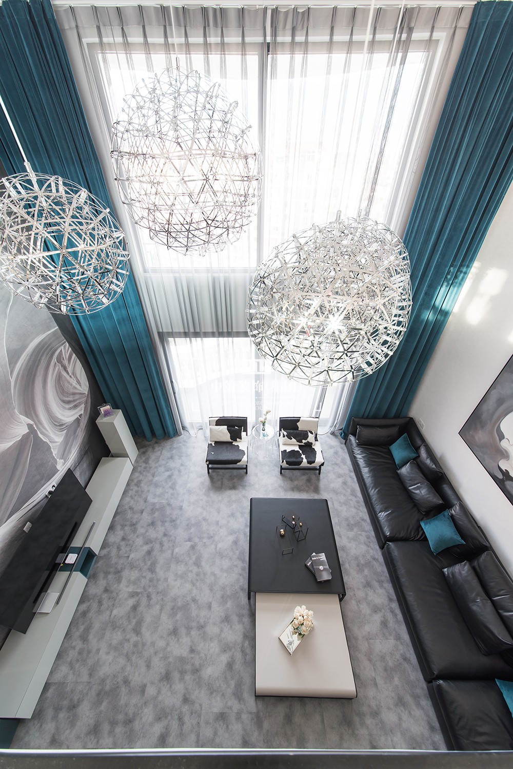 本案屋主想要一个现代简约的风格,黑白灰,舒适、简约、简单的生活空间。设计师从屋主的生活习惯及喜好出发,色彩上选择理性的黑白两色,为了协调清冷感,在软装配饰里加入了少许的蓝色,柔化空间的同时也让现代空间具有了时尚感。