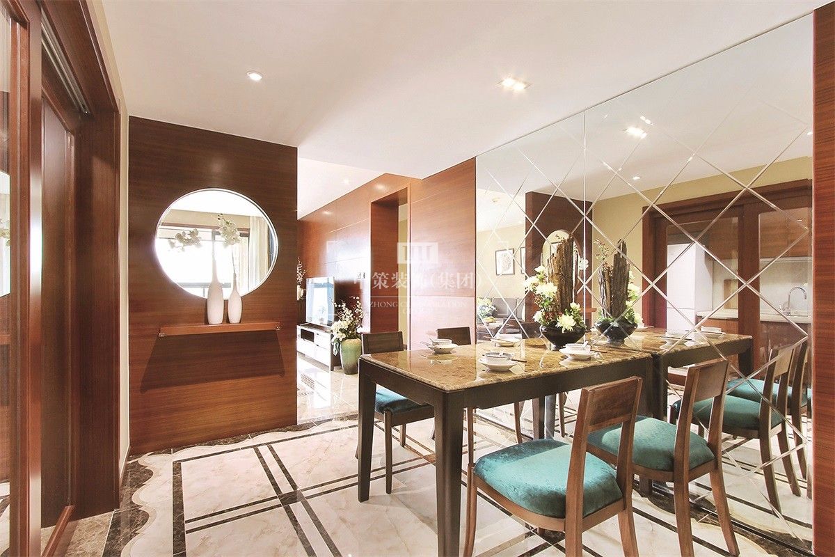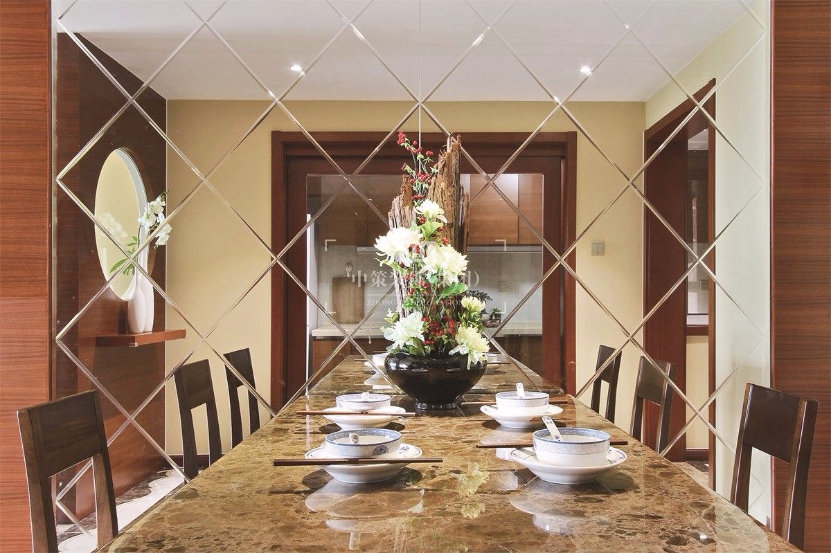 客餐厅里,木质让人感觉自然亲切,设计师大胆地运用蓝色系等现代色彩表现,并利用鸟雀花卉等图案来表达书香的概念,几处点睛之笔便营造出一个浓郁的中式韵味空间:以一隅优雅显一室繁华,入户即见白玉花瓶,营造入户的东方意象。置身其中,仿佛能够忘掉一切世俗纷扰,心灵被中式艺术氛围所净化。